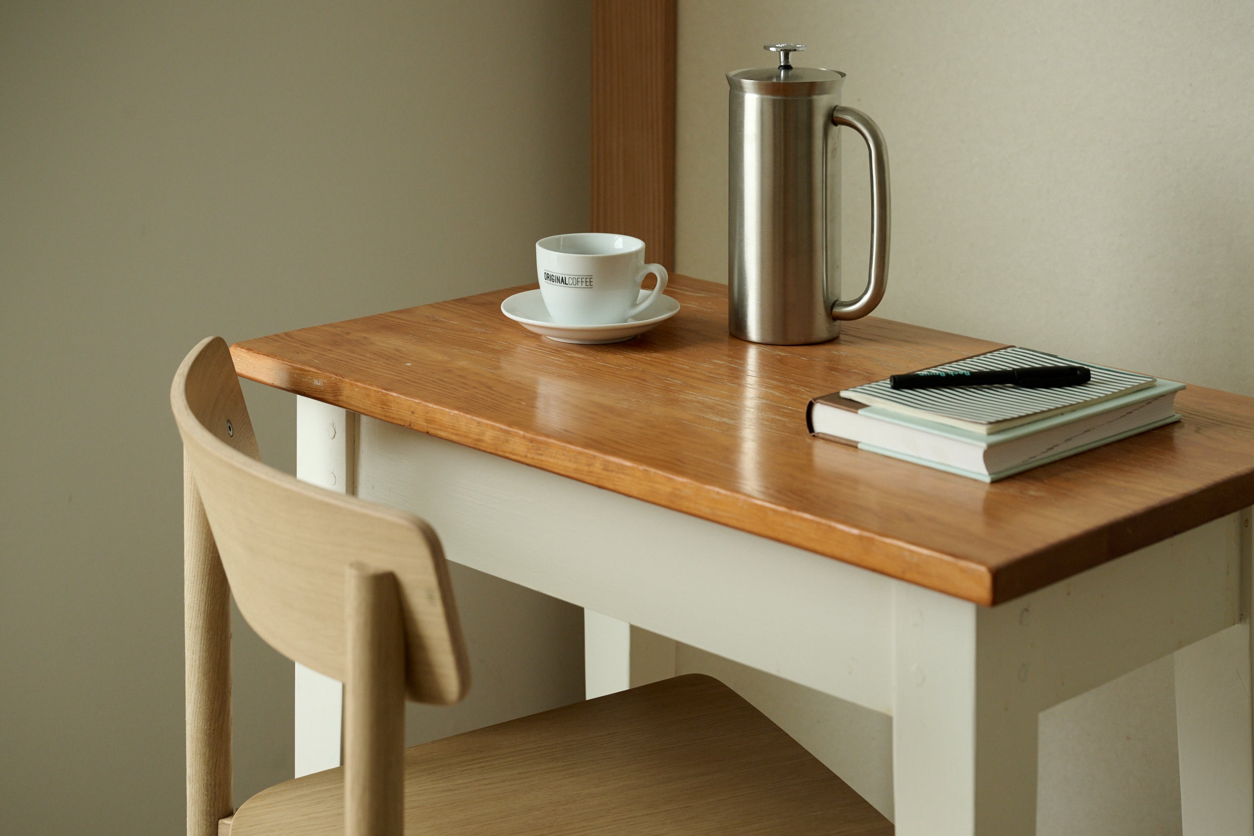 2. Vej 45,5 g kaffe (ca. 6,5 g pr. 100 g vand) og kværn den mellemgroft. Hæld kaffen i stempelkanden og ryst let, så den ligger jævnt.